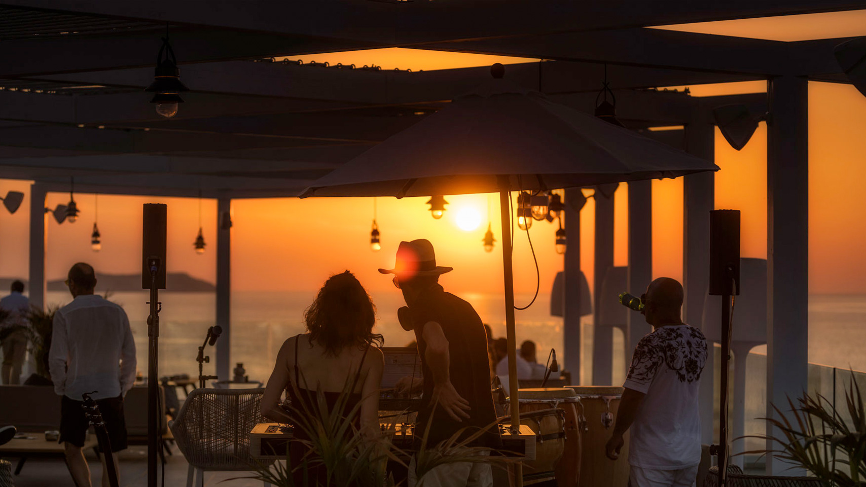 Des DJs en live installent l’ambiance au coucher du soleil.